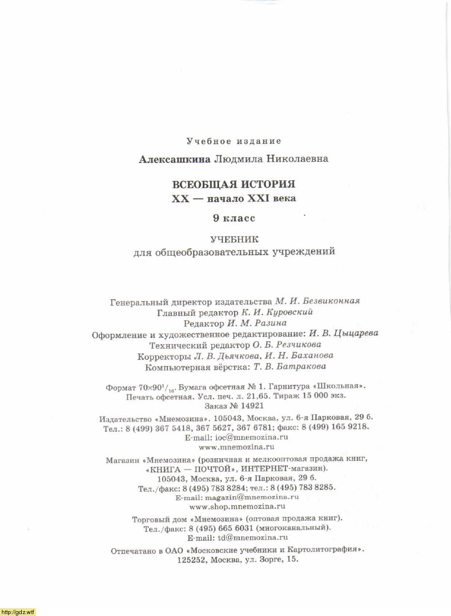 Л.Н. Алексашкина. Всеобщая история. XX- начало XXI века. 9-ый класс. Учебник. История 9-ый класс